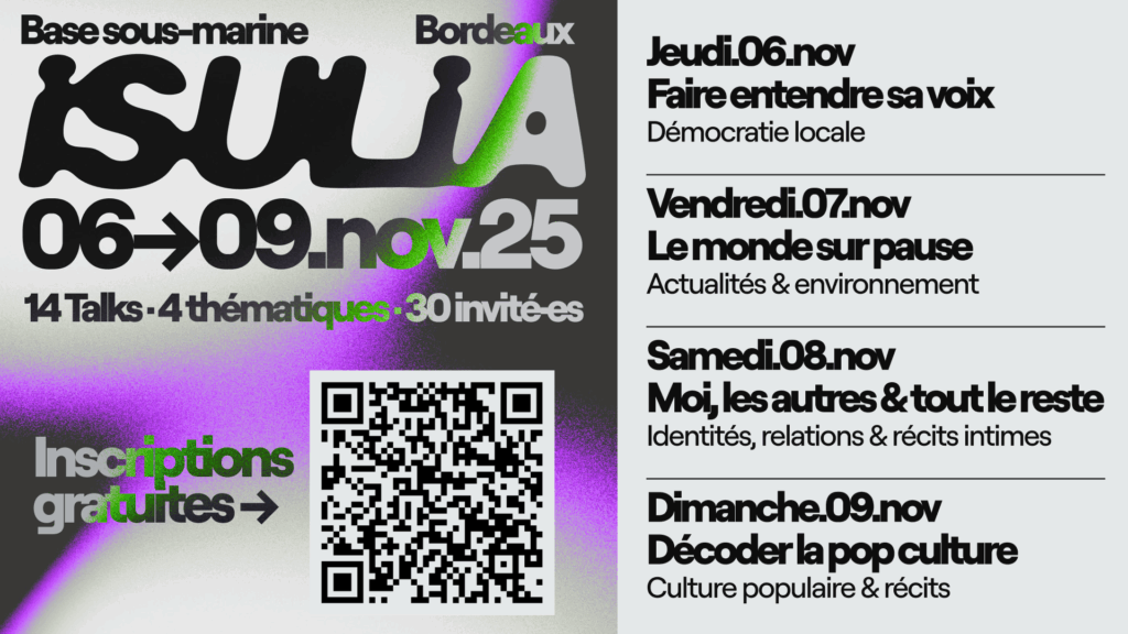 Le Festival propose une programmation où les musiques électroniques rencontreront performances hybrides, talks, expériences et ateliers participatifs Pendant quatre jours, les Talks d’Isulia ouvrent un espace pour explorer des sujets qui nous concernent toutes et tous, poser des questions, confronter des points de vue et imaginer des réponses collectives. Chaque journée s’articule autour d’une thématique […]